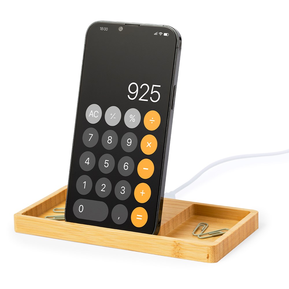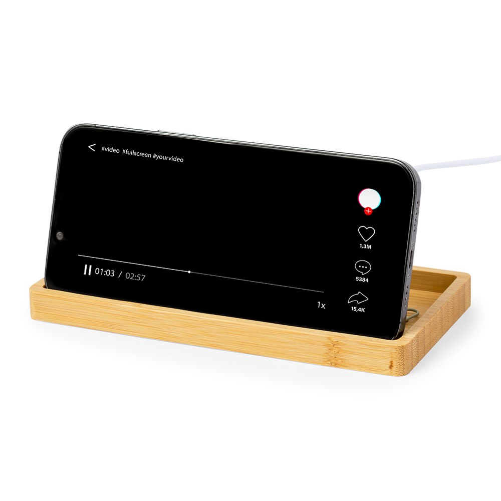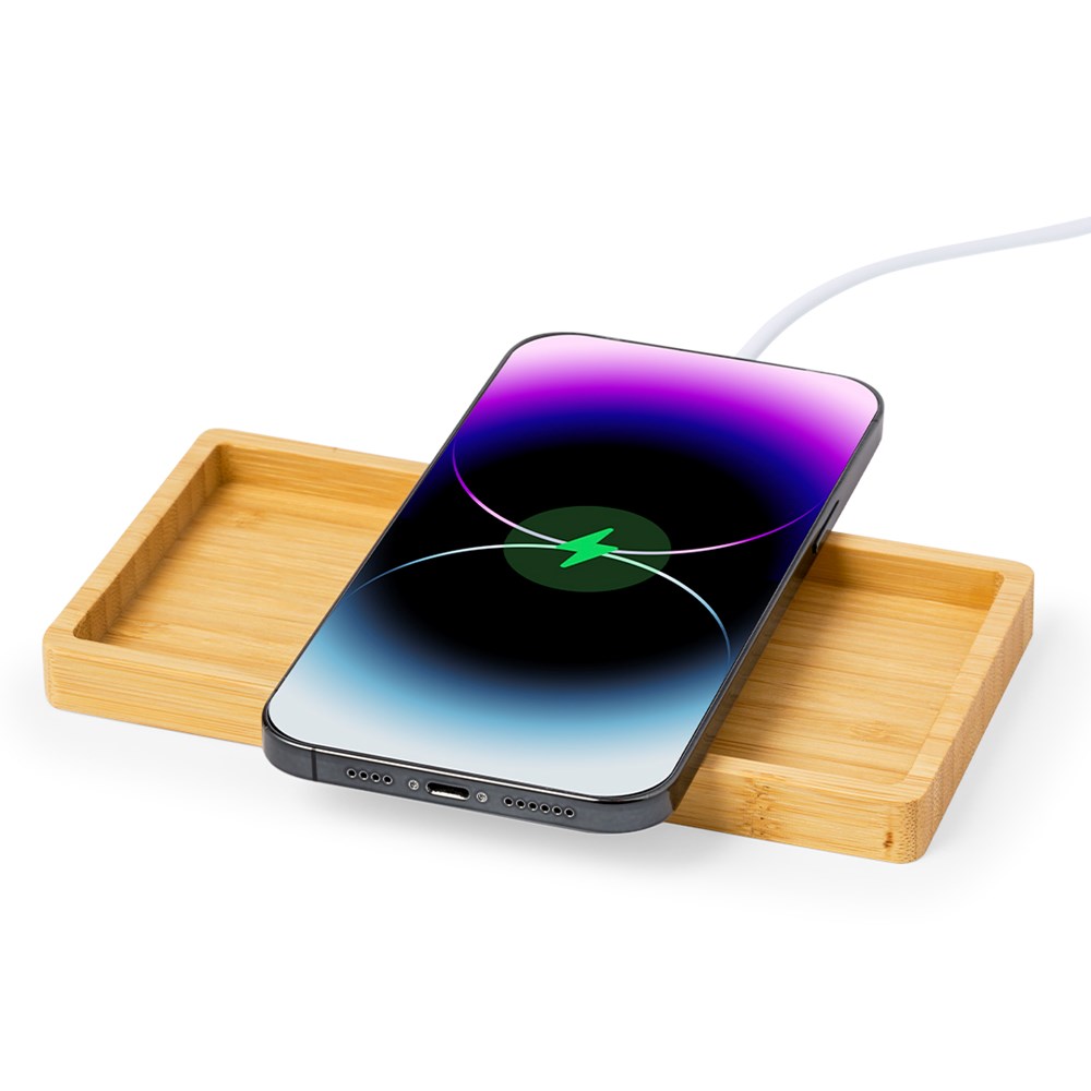 Wireless charger and organiser 15W, made of bamboo. With smartphone holder function and extra compartments for objects, compatible with devices equipped with wireless charging technology. Large branding surface and presented in an individual kraft box. Instructions manualin English and Spanish available.Materials such as bamboo encourage the use of natural raw materials, reducing pollutant emissions. It comes from a highly resistant and versatile plant with rapid growth and regeneration, making of it an excellent alternative to traditional wood.Manufactured according to RoHS standards and in compliance with the following safety requirements: Overheating protection system. Over-charge protection system. Blocking system to prevent short circuits.