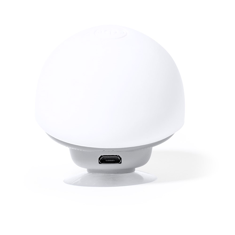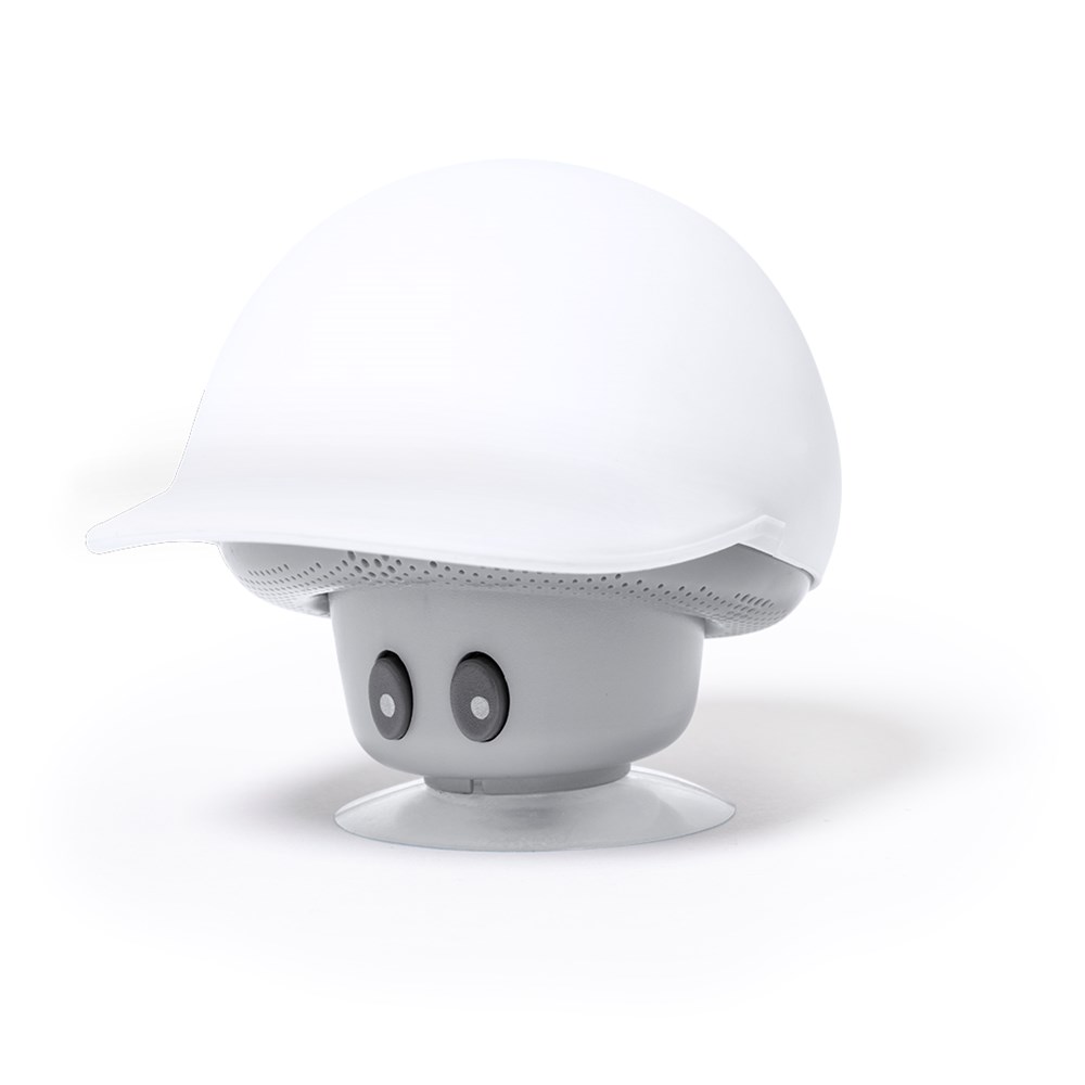Speaker in an original mushroom design with cap, with mobile phone holder function. Bluetooth® 5.0 connectivity, with 3W power and hands-free mode. Body with soft rubber touch finish and suction pad for holder function. Micro USB cable included, and presented in an attractive kraft design box. Instructions manual available in English and Spanish.