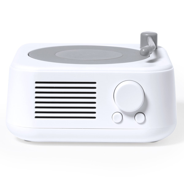 Bluetooth® speaker in an original turntable shape, compact in size and with 5W power. 800mAh lithium battery, with Type C charging cable included and charging status indicator light. Hands-free function and FM radio, with slot for micro SD cards up to 32GB capacity and an auxiliary input for 3.5mm jack connector. Made of resistant white ABS with grey details, and presented in an individual kraft design box, with instructions manualin English and Spanish.