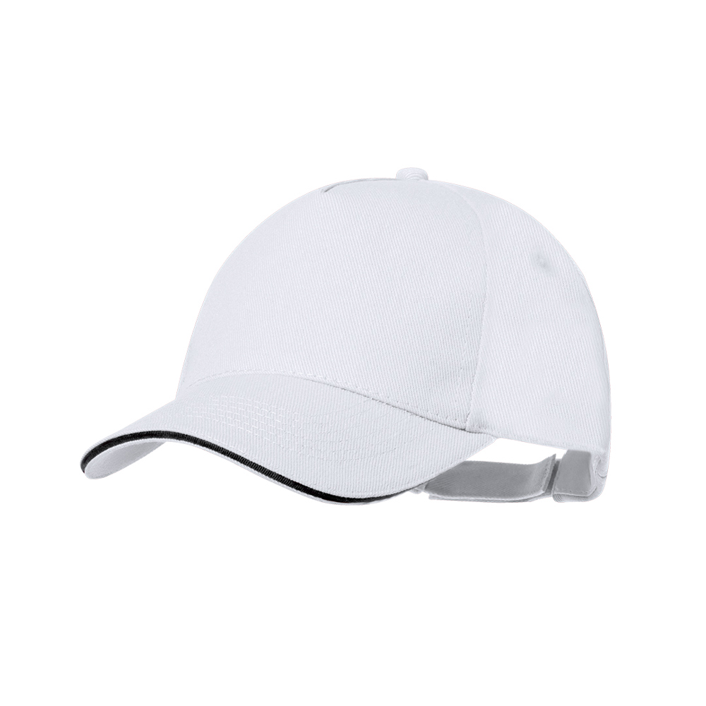 5 panel cap in RPET polyester material. In a wide range of bright colours, with coloured sandwich and padded visor. Embroidered ventilation holes and adjustable velcro fastening. With RPET label.RPET material is made from recycled plastic, thus promoting the reuse of plastic waste and helping the sustainability of the planet.