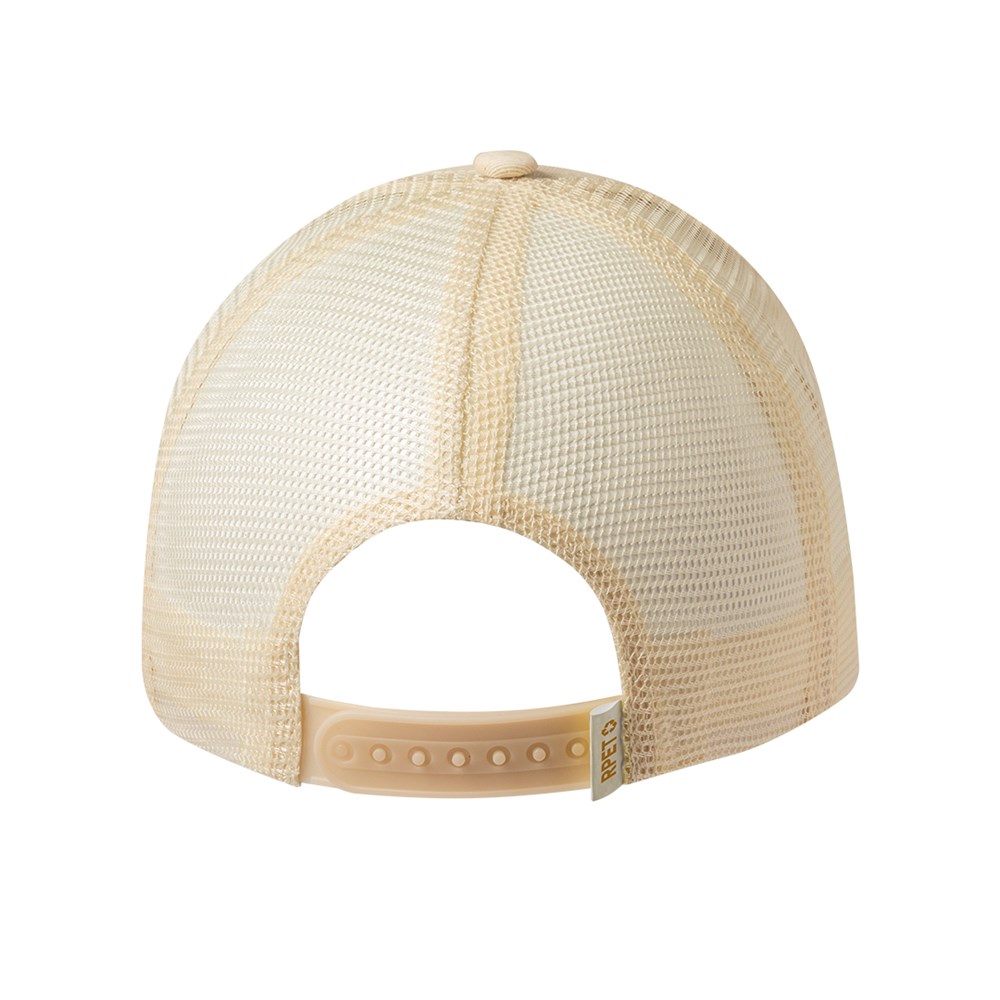 5 panel trucker cap made of durable RPET polyester. With stitched front panel and mesh back, with matching and adjustable plastic fastener in natural colour and RPET label.RPET material is made from recycled plastic, thus promoting the reuse of plastic waste and helping the sustainability of the planet.