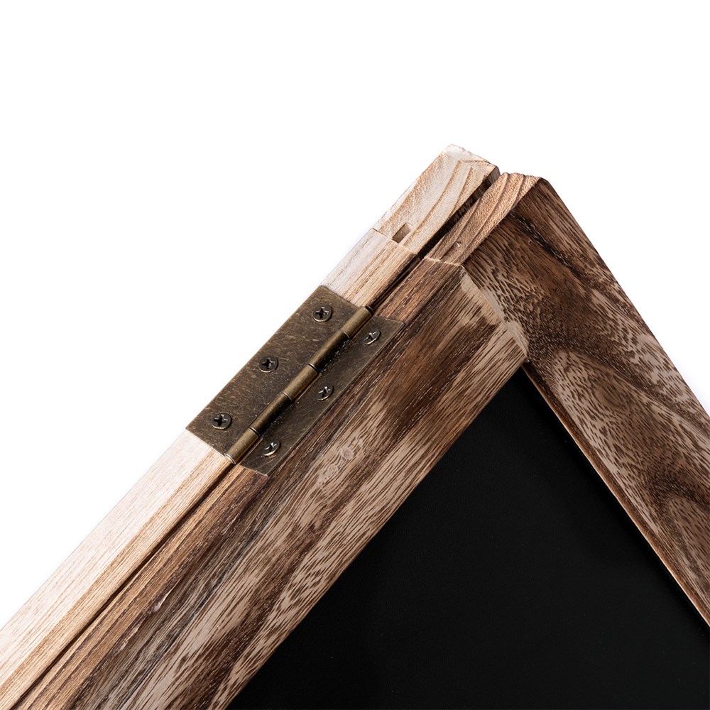 Multipurpose blackboard made of wood. Designed to fit in any environment and easy to transport as it is foldable. Large writing surface on both sides, with a total size of 106 cm in height and 59 cm in width. Presented in a kraft design box.