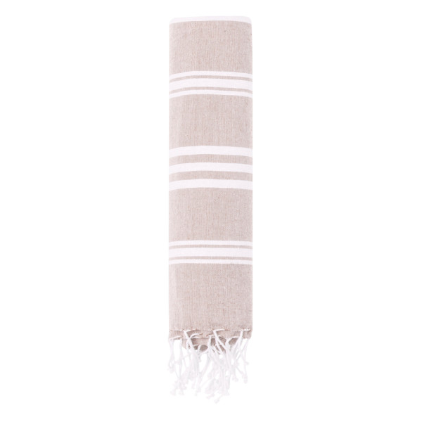 Soft pareo towel in a combination of 130g/m2 recycled cotton on the front side and 125g/m2 polyester at the back. Available in a wide range of two-tone colours, with side label. Presented in an individual bag.