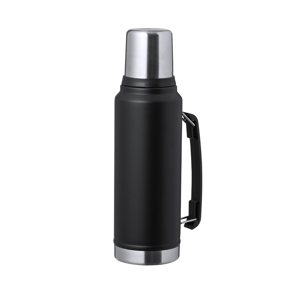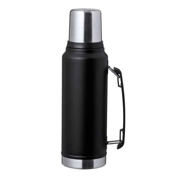 Stainless steel thermos with a capacity of 1L. Combination of black colour and polished steel, elegant finish, and screw lid with tumbler function and 200 ml capacity. Handle on the side for easy carrying and presented in a kraft design box.