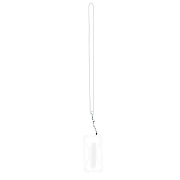 Practical lanyard made of resistant silicone. Includes a matching mobile phone accessory, reinforced at the corners and with a fold-out holder at the back. With metal swivel carabiner and available in a wide range of colours.