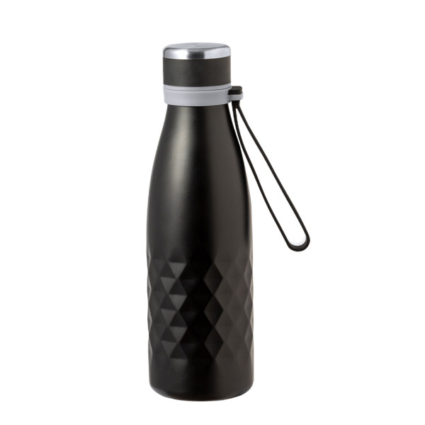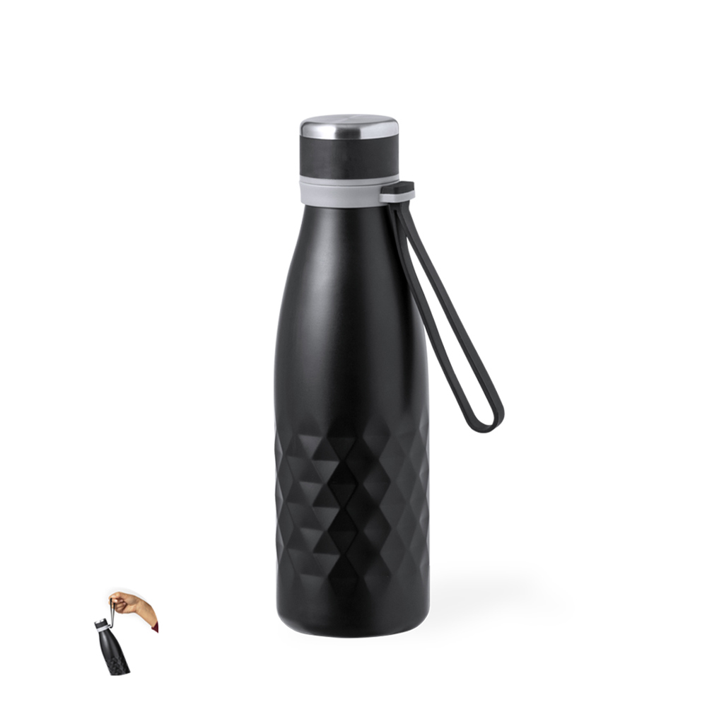 Stylish 550 ml capacity thermos bottle, made of stainless steel with double wall, with a screw cap for optimal sealing. Comes with a convenient matching handle in cosy silicone. Available in a wide range of metallic colours, with an elegant diamond pattern around the body. Presented in an individual kraft design box.