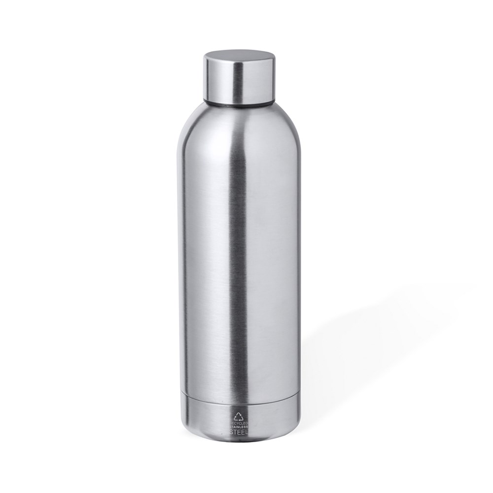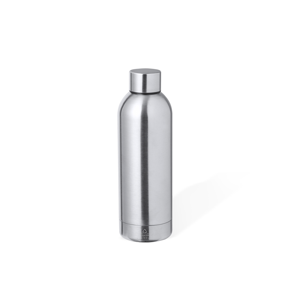 Recycled Stainless Steel thermal bottle with double-layer and a capacity of 500 ml. Screw lid for optimal sealing and with Recycled Stainless Steel logo. Presented in an attractive kraft design box.Steel is one of the most demanded materials and can be found almost everywhere, from everyday products to major constructions. With countless properties, including durability and a high level of reusability, it is a much valued alternative for sustainable solutions. Properly treated, new resources of infinite use can be obtained.