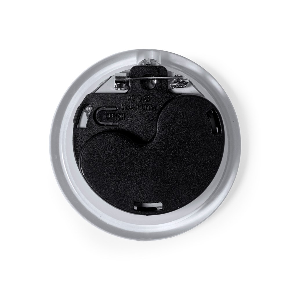 Original pin with LED light and powered by a button cell battery -included-. Using the button at the back of the item, the light can be set to three positions (steady light and fast/slow flashing light). With safety pin for fastening and presented in an individual kraft design box.