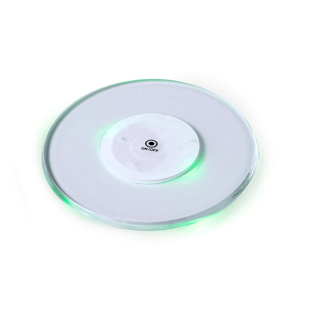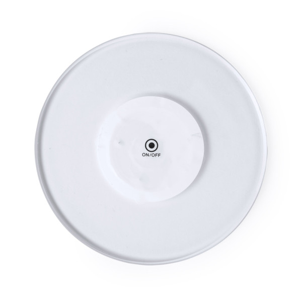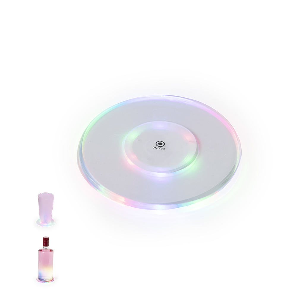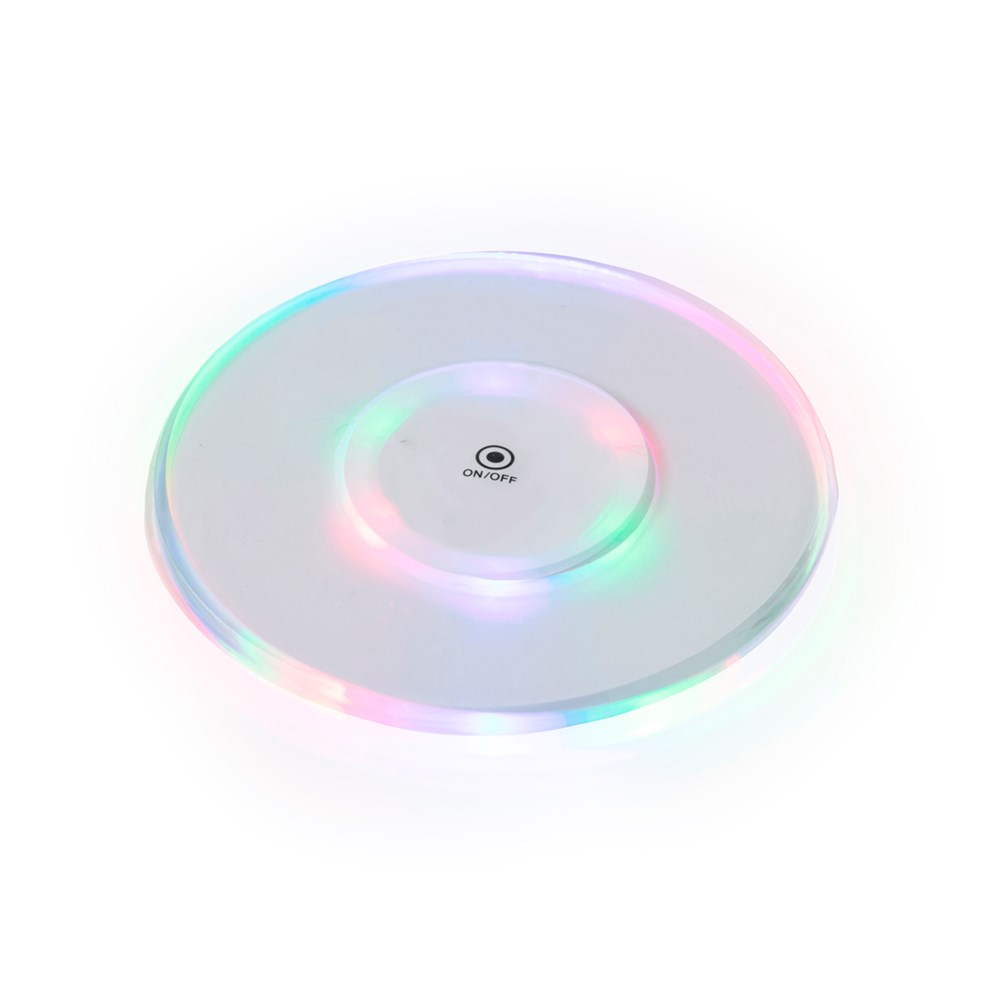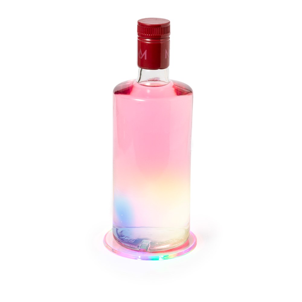 Original coaster with 6 LEDs for the illumination of drinks. With button on the base and 3 lighting positions (fixed light and fast or slow flashing light). It is attached to the base of any drink with self-adhesive tape and is powered by two button cells (included).