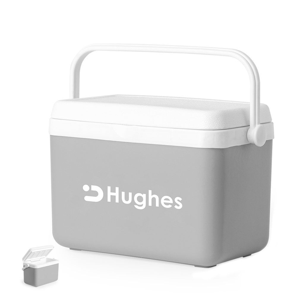 4L cooler made of PP. Attractive vintage design to keep drinks and food cool, with rigid double wall design. Hinged lid with safety lock and handle for easy carrying. With grey base and white accessories. Presented individually in a recycled bag.