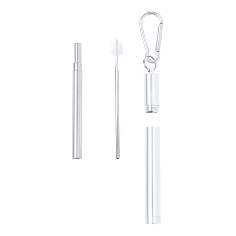Reusable and extendable stainless steel straw with silicone mouthpiece. With cleaning accessory included and presented in a matching case with carabiner for transport.
