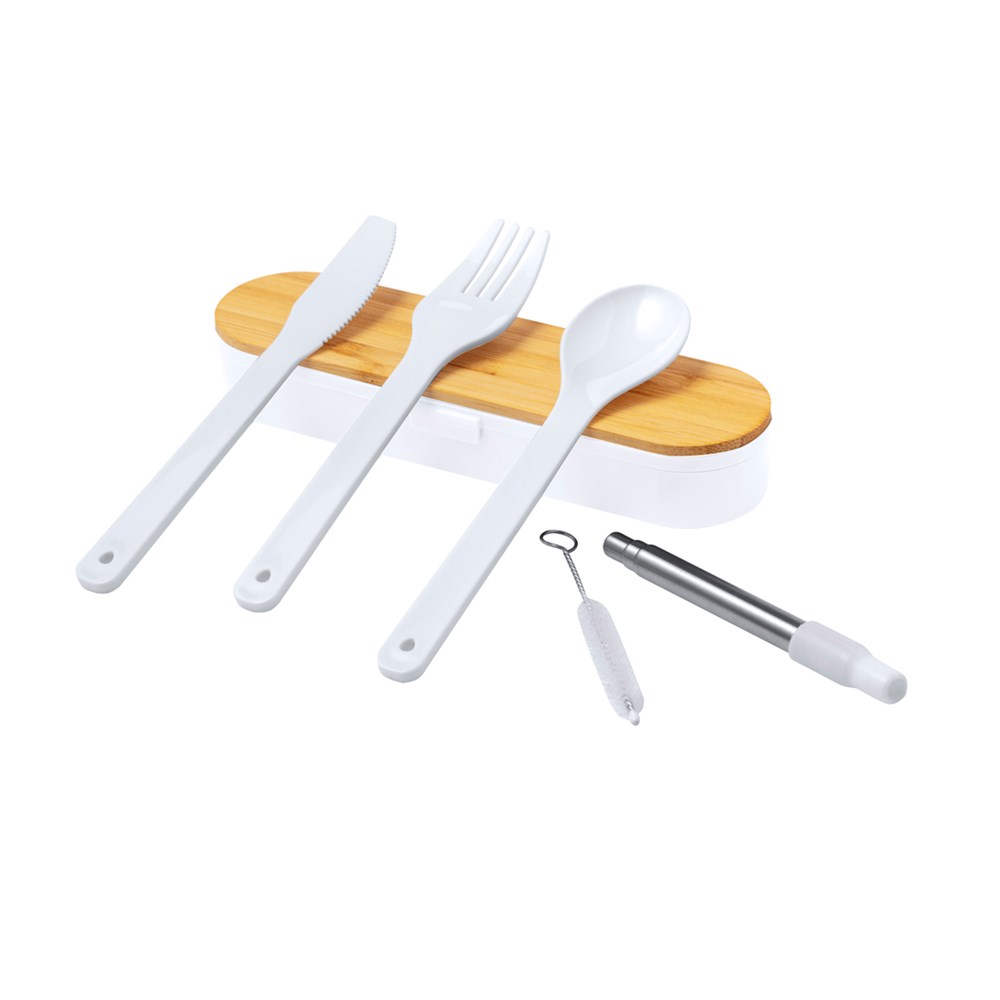 Cutlery set made of PP and BPA free, with matching display box and with bamboo lid. This complete set includes spoon, fork, knife and folding straw with cleaner. Food Grade Certified, guaranteeing safety when food comes into contact with the material used to manufacture the product. Presented in an individual recycled bag.Materials such as bamboo promote the use of natural raw materials, thus reducing pollutant emissions. It comes from a highly resistant and versatile plant, with rapid growth and regeneration, making it an excellent alternative to the use of traditional wood.