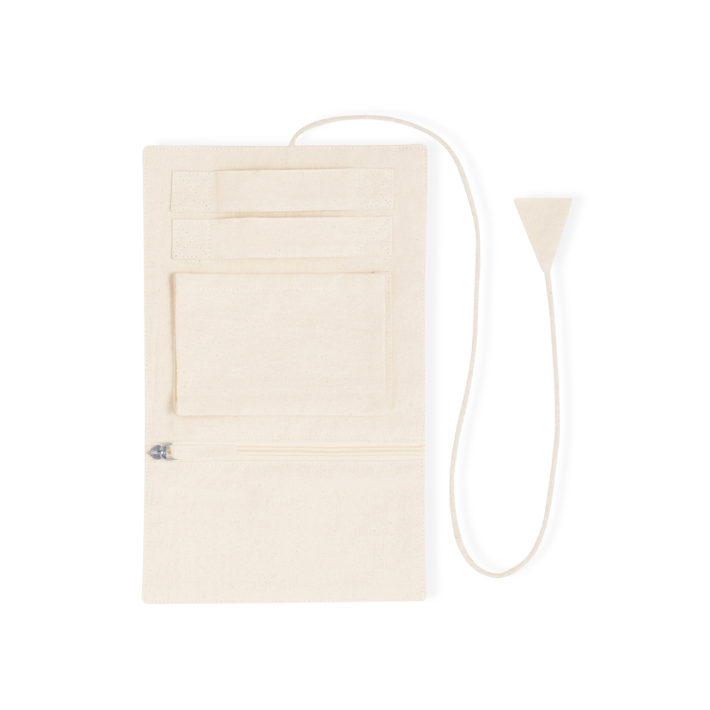 Foldable jewellery box made of cotton, for storing precious personal items. In natural color, with 3 differen parts: upper part with ribbons, central part with pocket and lower part with zipped pocket. It can be folded and held fir mly with its matching cord.