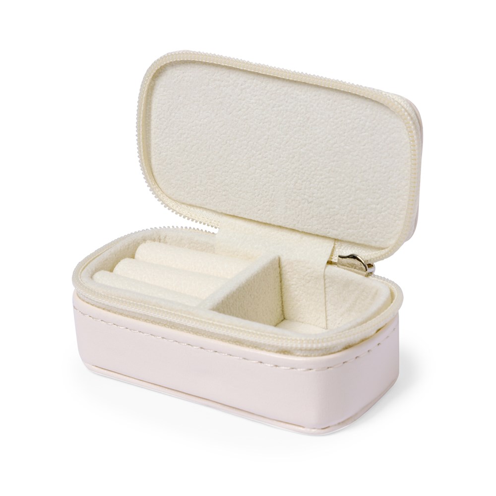 Jewellery box made of PU leather. Natural colour design with zip closure and two compartments inside. One compartment in the shape of a box and another compartment with pads for rings and earrings, lined with soft fabric. Presented in an individual paper bag.