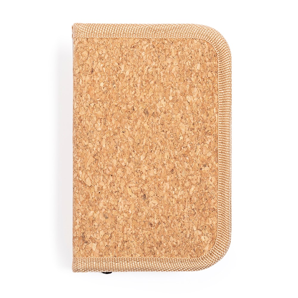24-accessory tool set in a cork case with inside elastic bands. Includes socket spanners, precision screwdrivers (flat and philips), multifunction handle with various interchangeable bits (extension, philips and flat; and adapters); and a tape measure. Presented in a kraft design box. Made with plant-based elements to promote the use of natural raw materials and reduce polluting emissions.