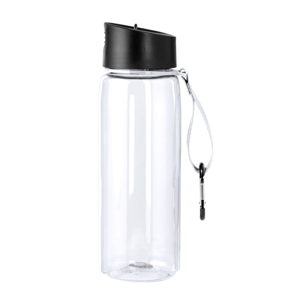 800 ml bottle made of resistant RPET with transparent body in a wide range of colours. Black screw cap, with a dispenser and a foldable dispenser. With matching carrying strap and metal carabiner for easy transport. Available in a wide range of colours.RPET material is made from recycled plastic, thus promoting the reuse of plastic waste and helping the sustainability of the planet.