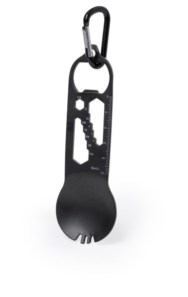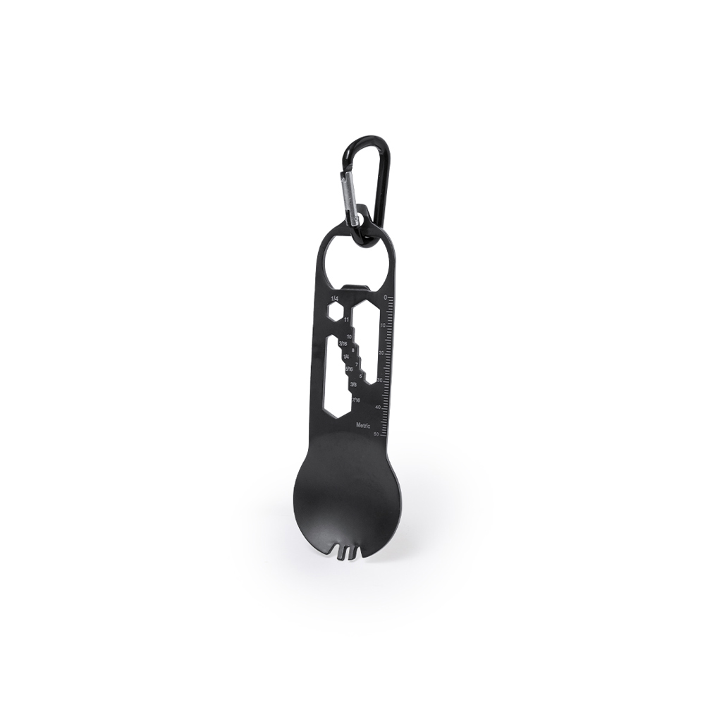 Complete multi-tool with 16 functions in stainless steel. Includes: carabiner for easy carrying, flat area for screwdriver function, bottle opener, ruler up to 5 cm on one side, central part for nuts of 11 different sizes (from 1/4 to 11) and practical spoon/fork. Presented in an individual bag.