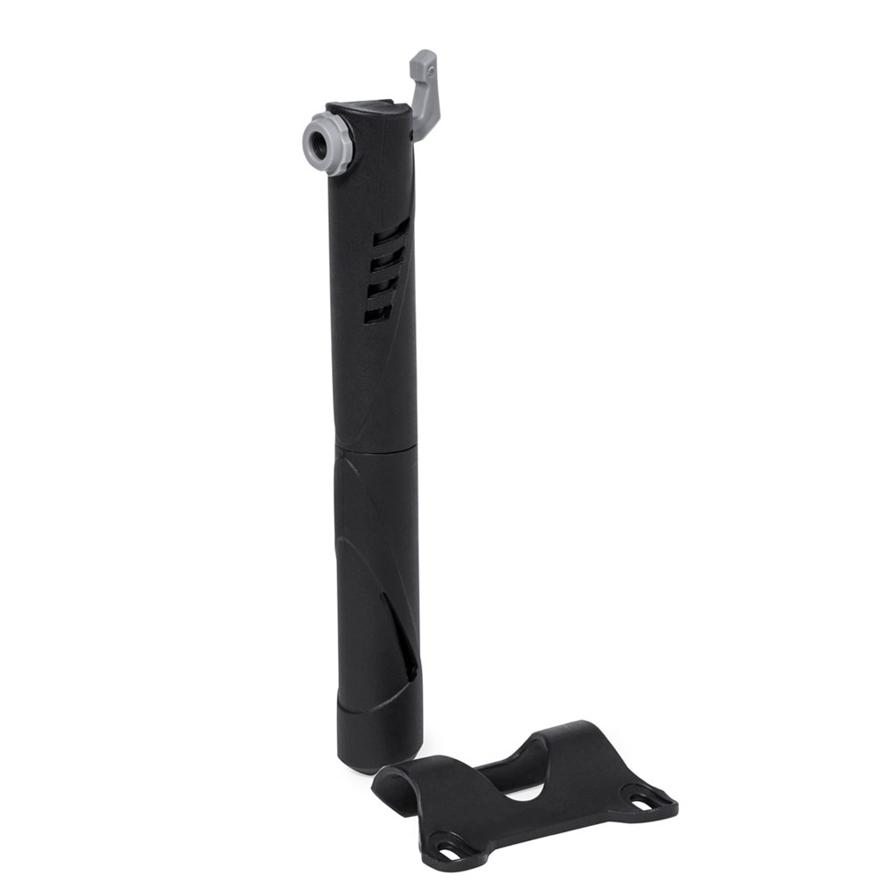 Convenient bicycle pump, made of resistant Aluminium. Manually operated and compact in size; with a fitting accessory suitable for all types of bicycles.