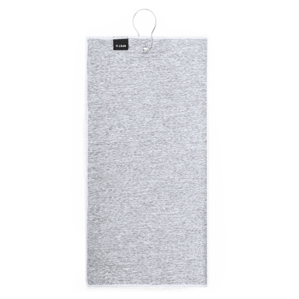 Golf towel made of RPET, absorbent and soft with dimensions of 40x60 cm. In the centre, it includes a reinforced ring and a carabiner, both made in stainless steel. With RPET label.RPET material is made from recycled plastic, thus promoting the reuse of plastic waste and helping the sustainability of the planet.