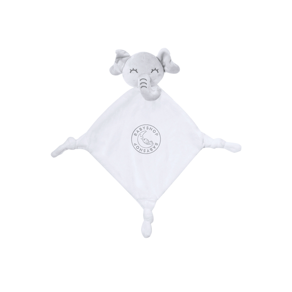 Tender doudou with cute white elephant design. With knots in each of the 3 corners to stimulate the baby's touch, favouring relaxation. Made from a single piece of fabric to avoid splitting into smaller pieces.