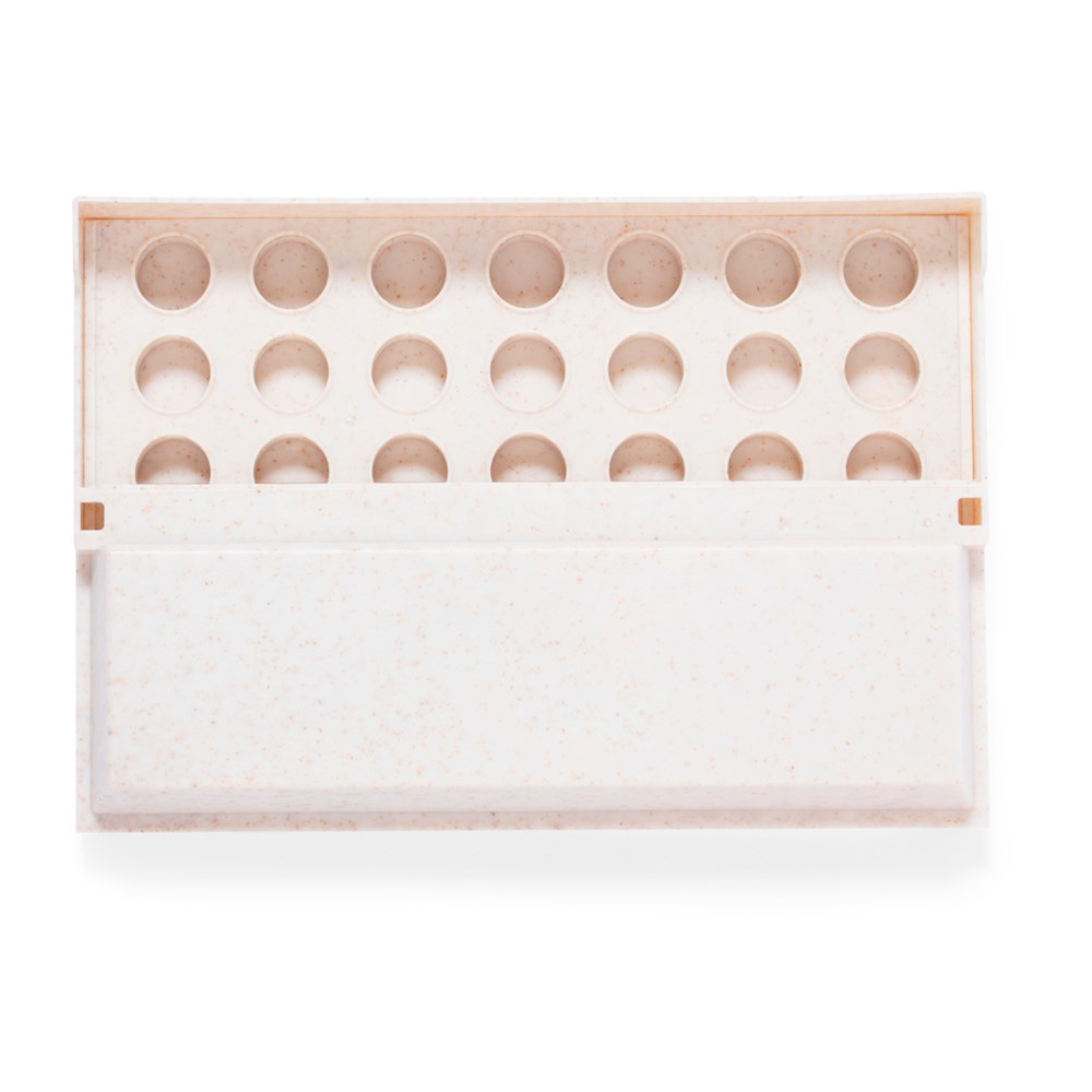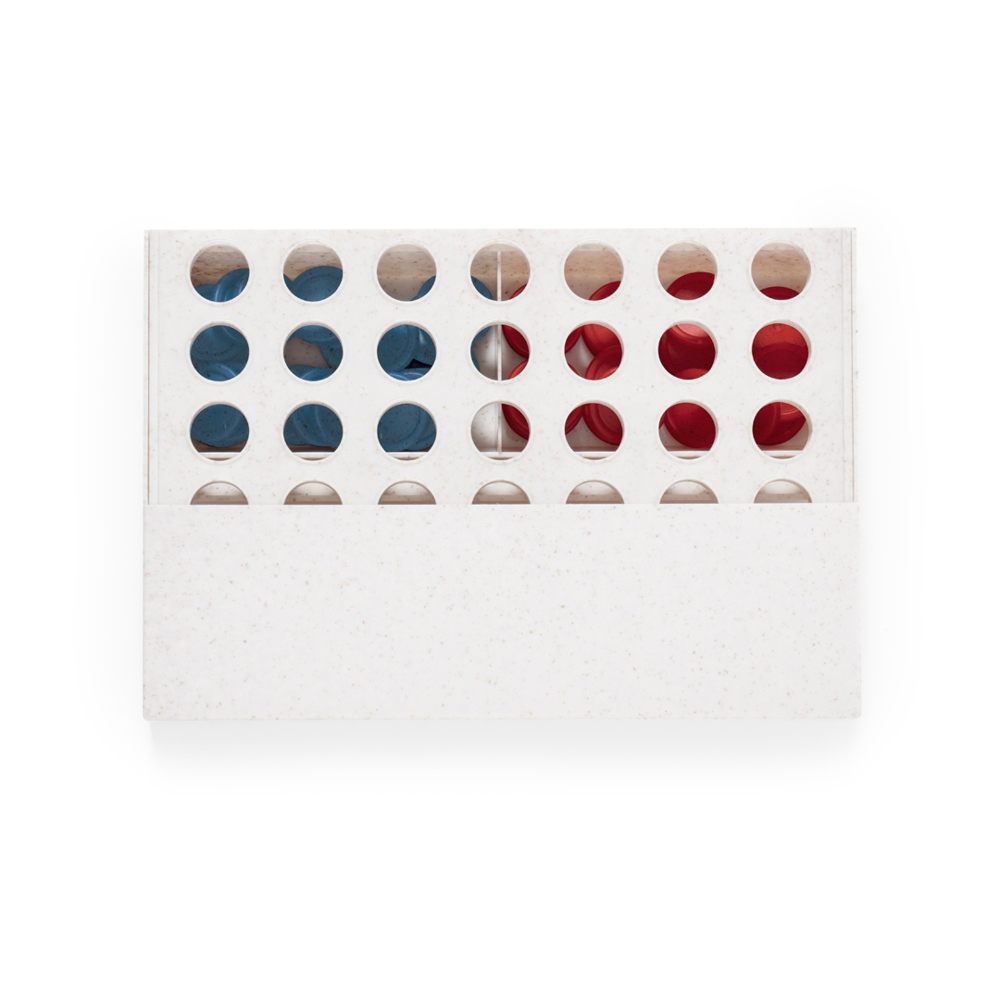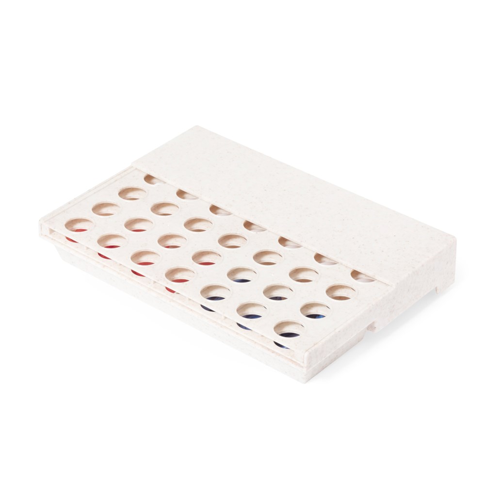Fun board game made of wheat straw. Composed of a vertical board and 42 circular pieces (21 red and 21 blue). Exciting for all ages by inserting the pieces through the slots to get 4 pieces in 1 row. Easy to assemble thanks to its mobile board that can be unfolded or folded. Presented in a kraft design box.