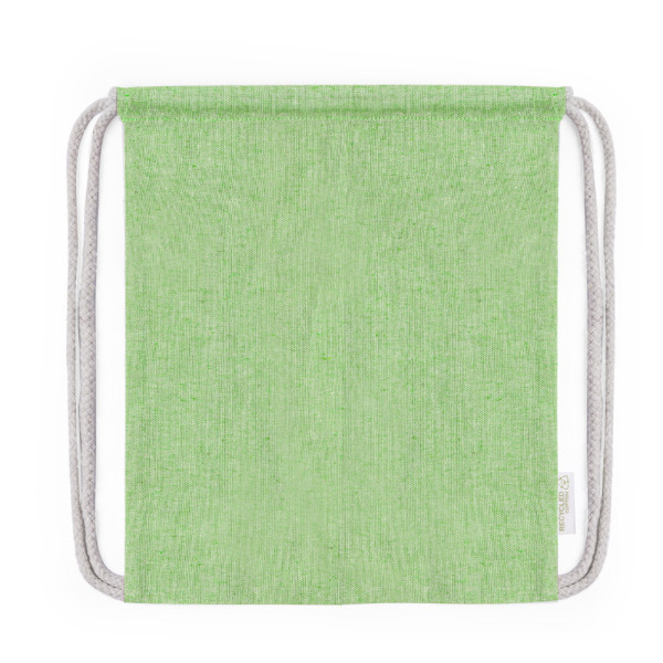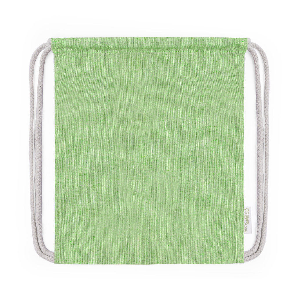 Drawstring backpack in Recycled cotton material 120 g/m2. Self closing strings in cotton, with eco label on one side and available in a wide range of nature colours. Resistance up to 4kg in weight.