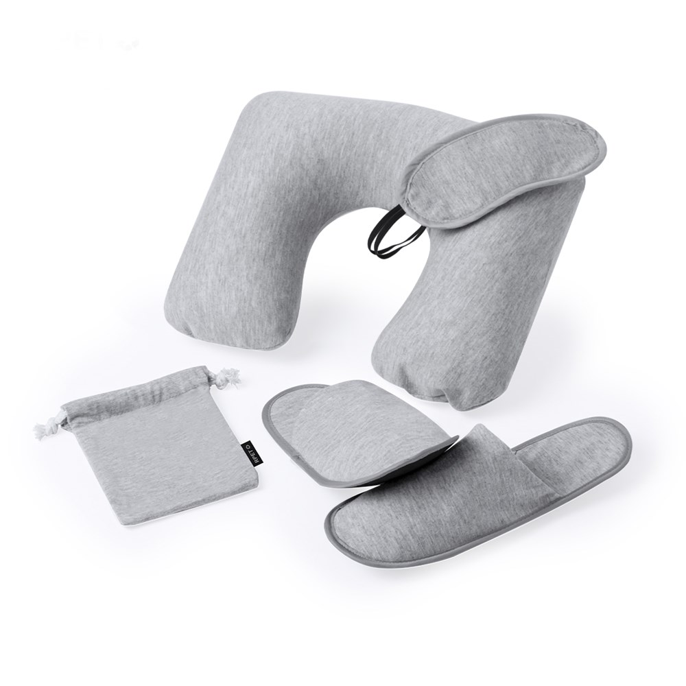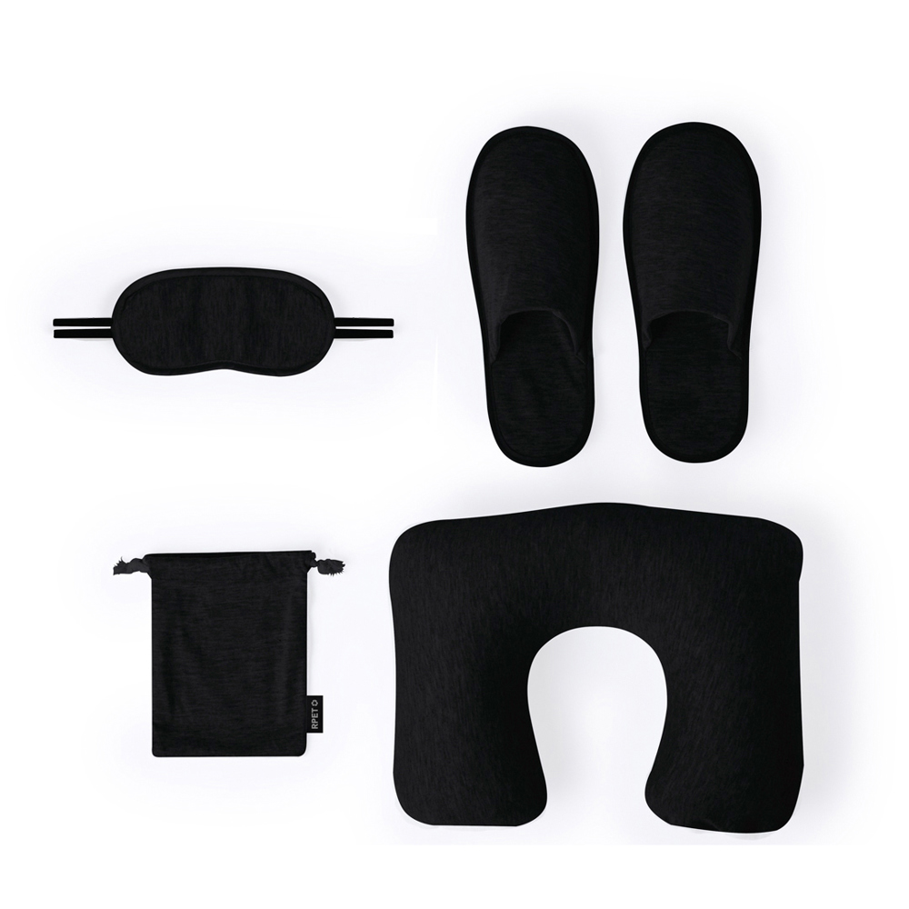 Great travel set in soft polyester. Including: Ergonomic neck pad. Soft mask with adjustable strap. Matching pair of slippers. Easy to store inside an RPET pouch and available in stylish colours, with RPET logo on the pouch.RPET material is made from recycled plastic, thus promoting the reuse of plastic waste and helping the sustainability of the planet.