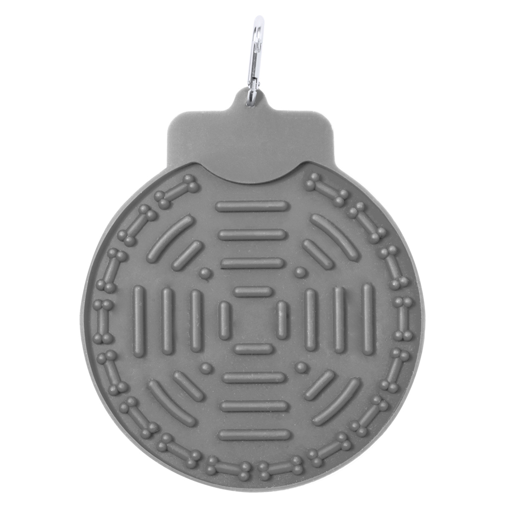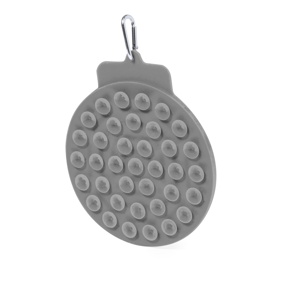 Pet licking pad made of soft silicone. With powerful suction cups to attach to flat surfaces so pets can lick the rough texture. Built-in carabiner for easy attachment. Presented in an individual recycled bag.