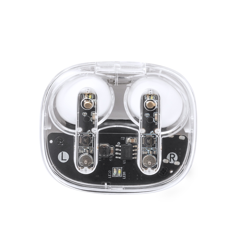 Earphones in distinctive transparent design. Bluetooth® 5.3 connection and long battery life. Ergonomically designed, with integrated touch control button on the headset, matching charging base and charging status indicators. Hands-free function. Charging port with Type-C input (cable included). Presented in individual kraft design box and recycled bag.
