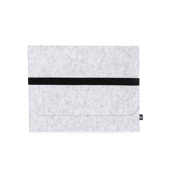 Laptop sleeve in durable recycled RPET felt. Flap with elastic closure and front pocket, with RPET logo on outside label. For laptops up to 15 inches.The recycled RPET felt is the result of the combination of the recycling process of plastic materials together with the millenary technique of felt making, resulting in an eco-trend material that, besides being of recycled origin, also becomes recyclable.
