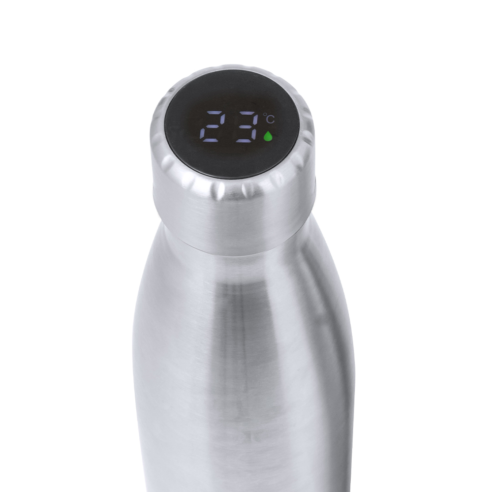 Double wall stainless steel thermal bottle with a capacity of 500 ml and matte finishing. Includes a tactile temperature indicator in the cap, and rechargeable battery -included Type C black cable-. BPA free safety cap and presented in an attractive individual kraft design box in a recycled bag. Battery powered (button cell included), with instruction manual available in English and Spanish.