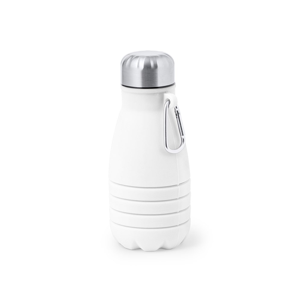 Foldable bottle with a capacity of 550 ml. Made in high quality silicone, with stainless steel cap. With a flexible matt finish body, this bottle can be folded for easy and convenient storage. Includes carabiner for easy carrying. BPA free. It is ideal for your desk, table, or any surface where you can enjoy your favorite drink. Folded dimensions: Ø7,1 cm x 16,9 cm height. Unfolded dimensions Ø7,1 cm up to 24,8 cm height.