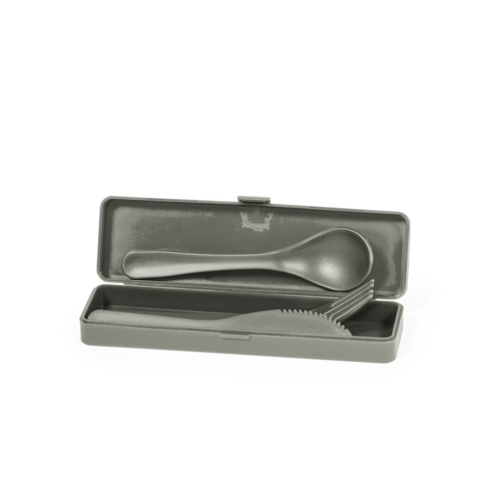 Cutlery set made in recycled BPA-free PP, with matching display box. Including spoon, fork and knife. Food Grade Certified, guaranteeing safety when food comes into contact with the material used to manufacture the product. Matte finish, outer case and cutlery available in a wide range of colours. Presented in an individual recycled bag.Recycled PP is a recycled and highly recyclable plastic, extremely resistant and suitable for a multitude of applications.