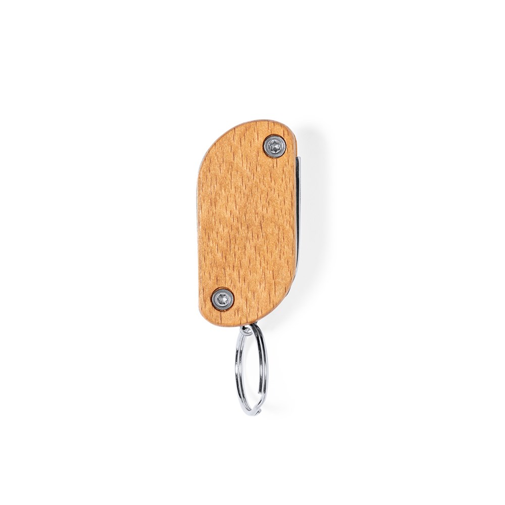 Handy multi-tool key ring made in resistant stainless steel and wood. With 9 functions: screwdriver, bottle opener, knife, can opener, file, several bits and one led torch. Battery powered (3 button cells included) and presented in an individual kraft design box.