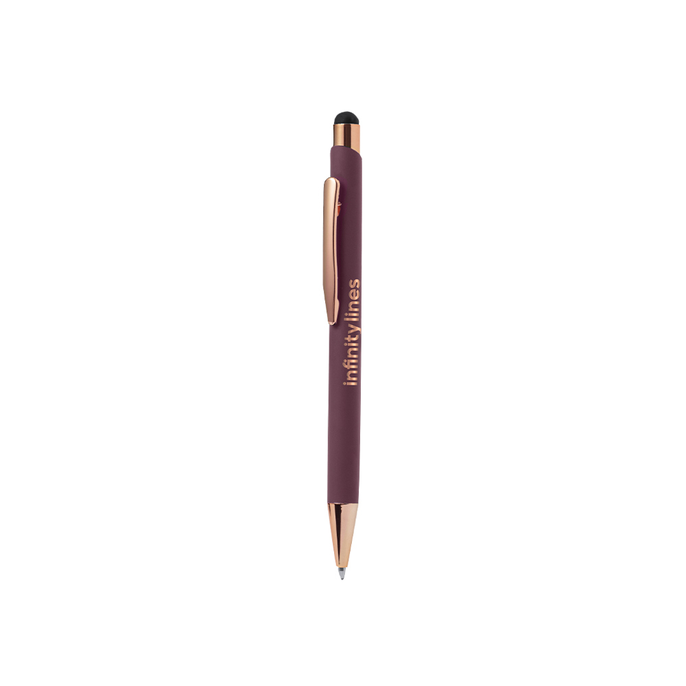 Rubber touch ball pen specially designed for laser marking with rose-coloured logo. Push-button mechanism, with metal clip and copper-plated fittings. Barrel available in 4 distinguished colours, jumbo cartridge and blue ink.Presented in an elegant black design box.