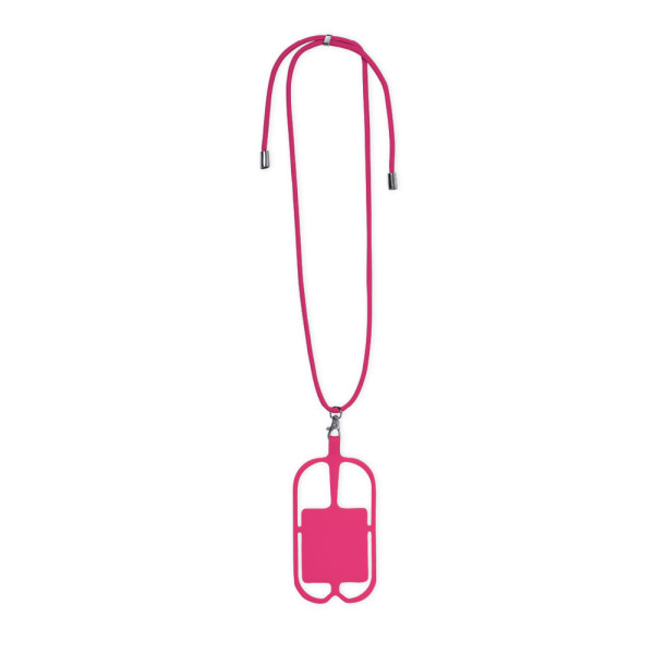 Unique lanyard for smartphone made in durable polyester and flexible silicone. With carrying accessory for all types of smartphones, suitable for all screen sizes. Neck adjuster and ends in chrome finish. Available in a wide range of colours.
