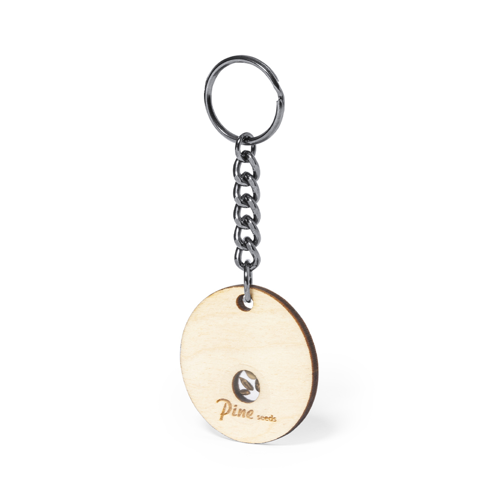 Keyring in soft and elegant beech wood. Including capsule with pine seeds. A respectful and sustainable gift to encourage and promote environmental care. Presented in an individual kraft design box.