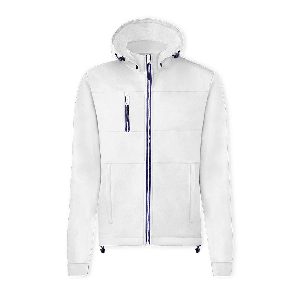 Jacket made of durable and breathable 300g/m2 soft shell material. Modern fit with central zip, side pockets and practical chest pocket with zip fastenings and contrasting zip pullers. Stand-up collar with adjustable and detachable hood. Bottom hem with adjustable string. Wind and water resistant soft shell outside, and warm micro fleece lining in contrast colour. Available in sizes XS, S, M, L, XL, XXL.
