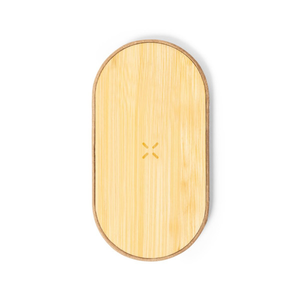 Wireless charger 10W in nature line, with base made of recycled cardboard and bamboo charging surface. Compatible with devices equipped with Qi wireless charging technology. With LED charging status indicator and Type C charging cable included. Non-slip base and presented in an individual kraft design box, with instruction manual in English and Spanish.Manufactured according to RoHS standards and in compliance with the following safety requirements:Overheating protection system.Over-charge protection system.Blocking system to prevent short circuits.