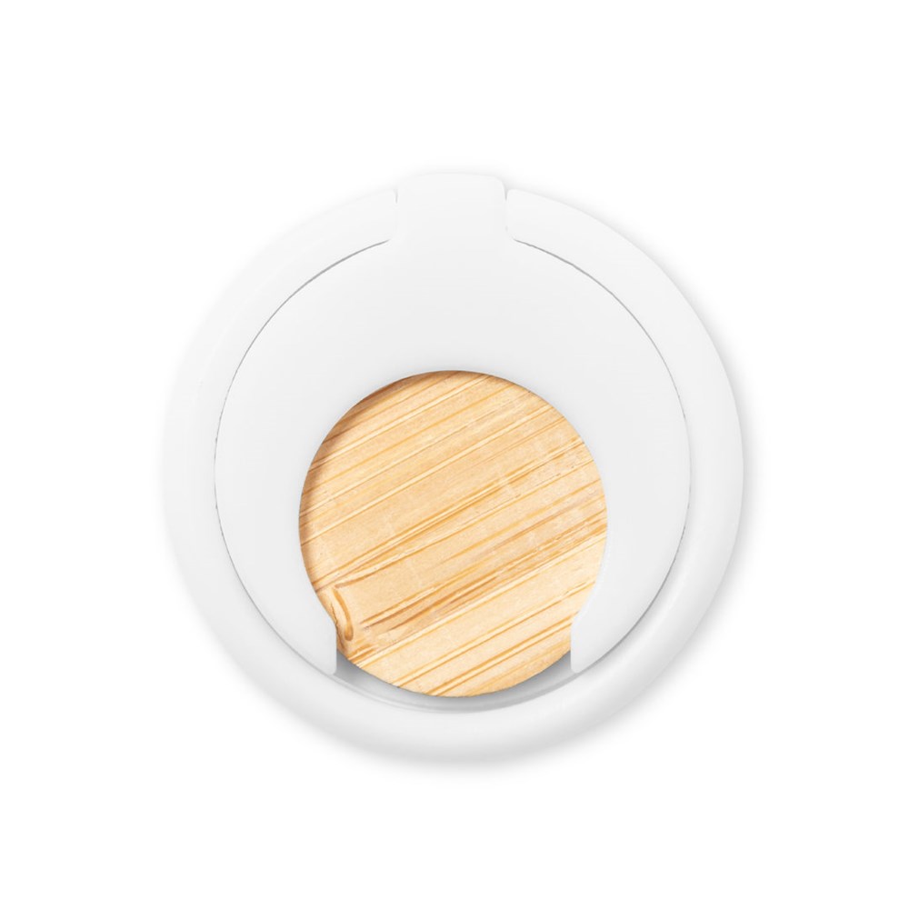 Multifunction smartphone holder with integrated coin for shopping trolley and folding ring/holder. Body made of durable ABS in white finish, with bamboo coin. With adhesive tape, extra strong fixation and residue free when detached from the device.