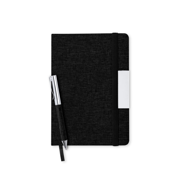 Set of notepad and ball pen in RPET, made from recycled plastic to encourage the reuse of plastic waste and help the sustainability of the planet. Including: Hard cover notepad, with metal insert on front cover, fabric bookmark and matching elastic binding. 100 sheets inside with striped layout and RPET distinctive at the back cover.Chrome-plated metal ball pen with RPET polyester-coated barrel. Elegant metal clip and matching accessories, twist mechanism and blue ink. With RPET distinctive on barrel.Set presented in an elegant black design case, with independent compartment for notepad and ball pen.