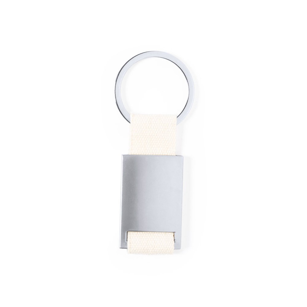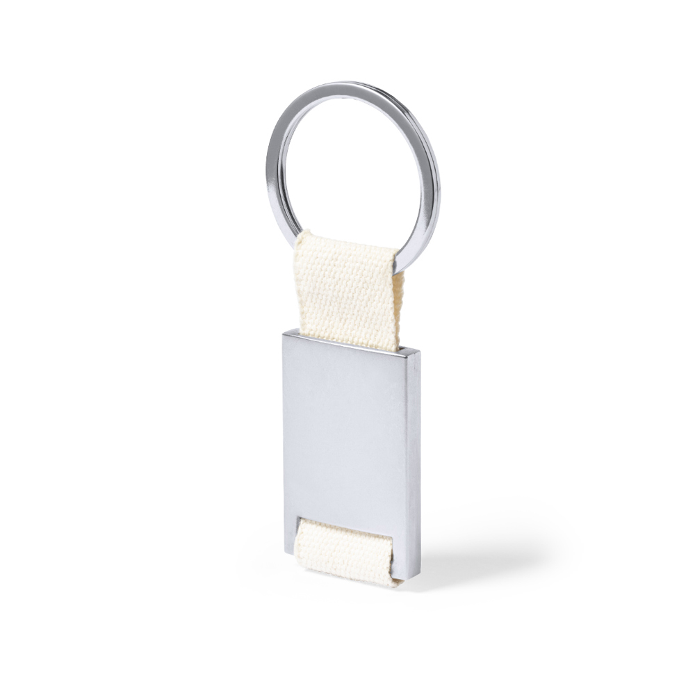Keyring with silver finish metal body. cotton ribbon with natural finish, with wide branding surface and matching metal ring. Presented in an individual bag with kraft cardboard insert.