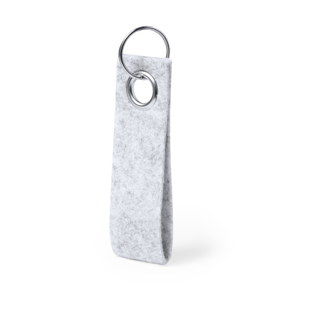 Elegant keyring with Felt RPET strap and chromed metal eyelet. With the distinctive of Felt RPET on the strap and chromed metal ring. Felt RPET is the result of the combination of the recycling processes of plastic materials along with the millenary technique of felt manufacturing, resulting in an eco-trend material that, in addition to being of recycled origin, also becomes recyclable.