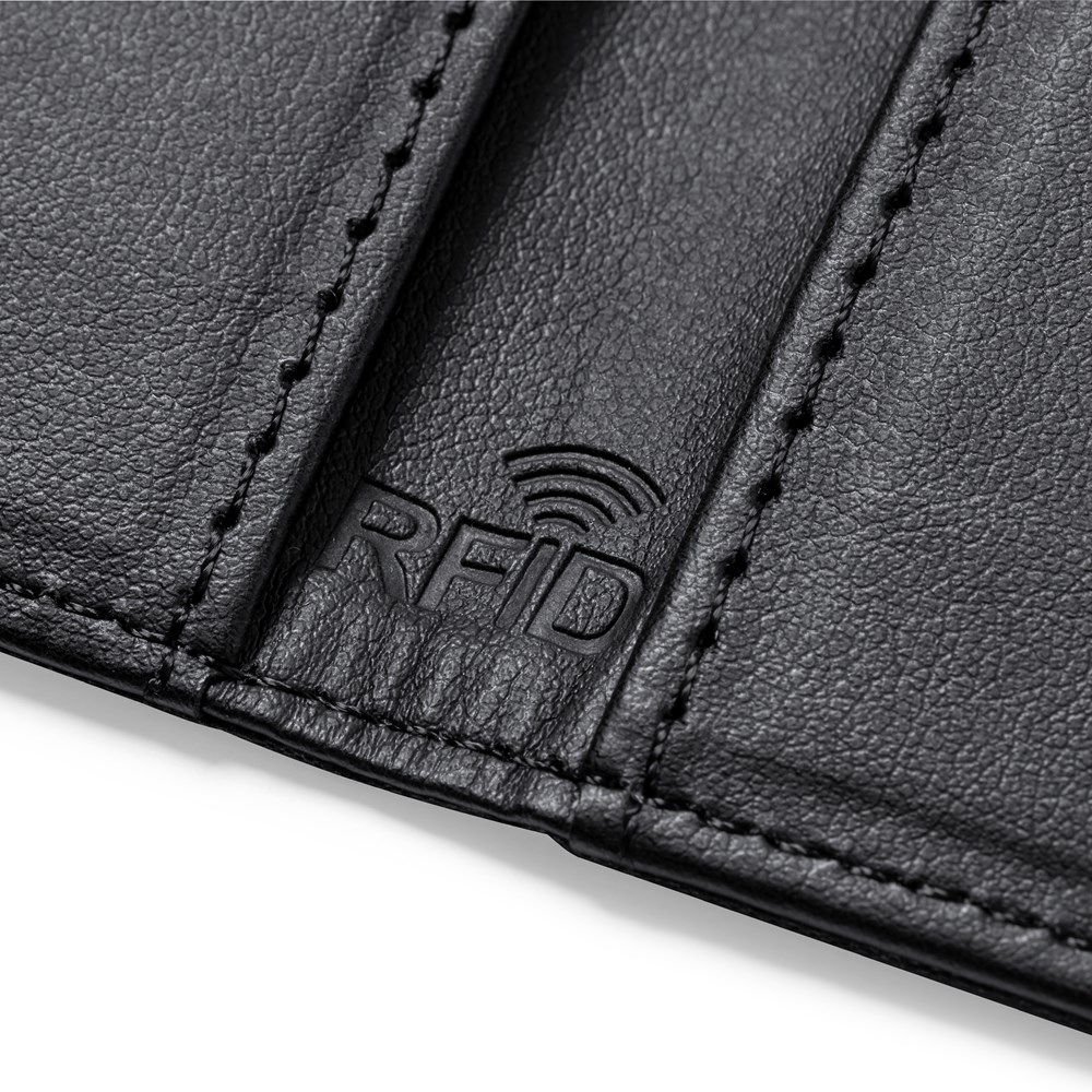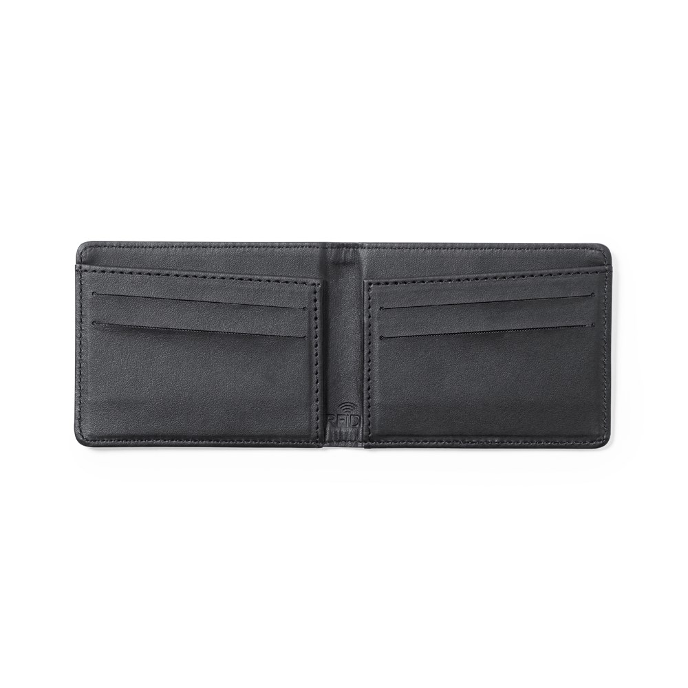 Elegant wallet and card holder made of RPET polyester with black finish. Inside with 6 independent compartments for cards and large wallet. RFID (Radio Frequency Identification) security technology that keeps card data safe. With the distinctive of RPET outside and the RIFD inside.RPET material is made from recycled plastic, to encourage the reuse of plastic waste and help the sustainability of the planet.