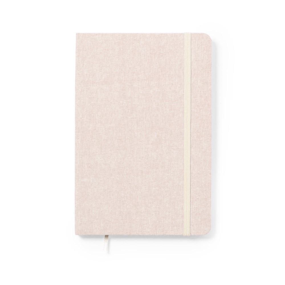 Nature line notepad made of recycled cotton. With hard covers and elastic band in contrasting colour. Inside with 100 plain sheets and fabric bookmark. Available in a wide range of colours, with recycled cotton logo on the back cover. GRS (Global Recycled Standard) certification available, guaranteeing the recycled origin of the material used to manufacture the product.