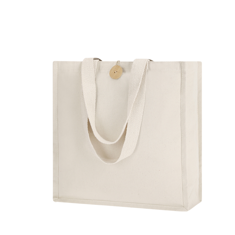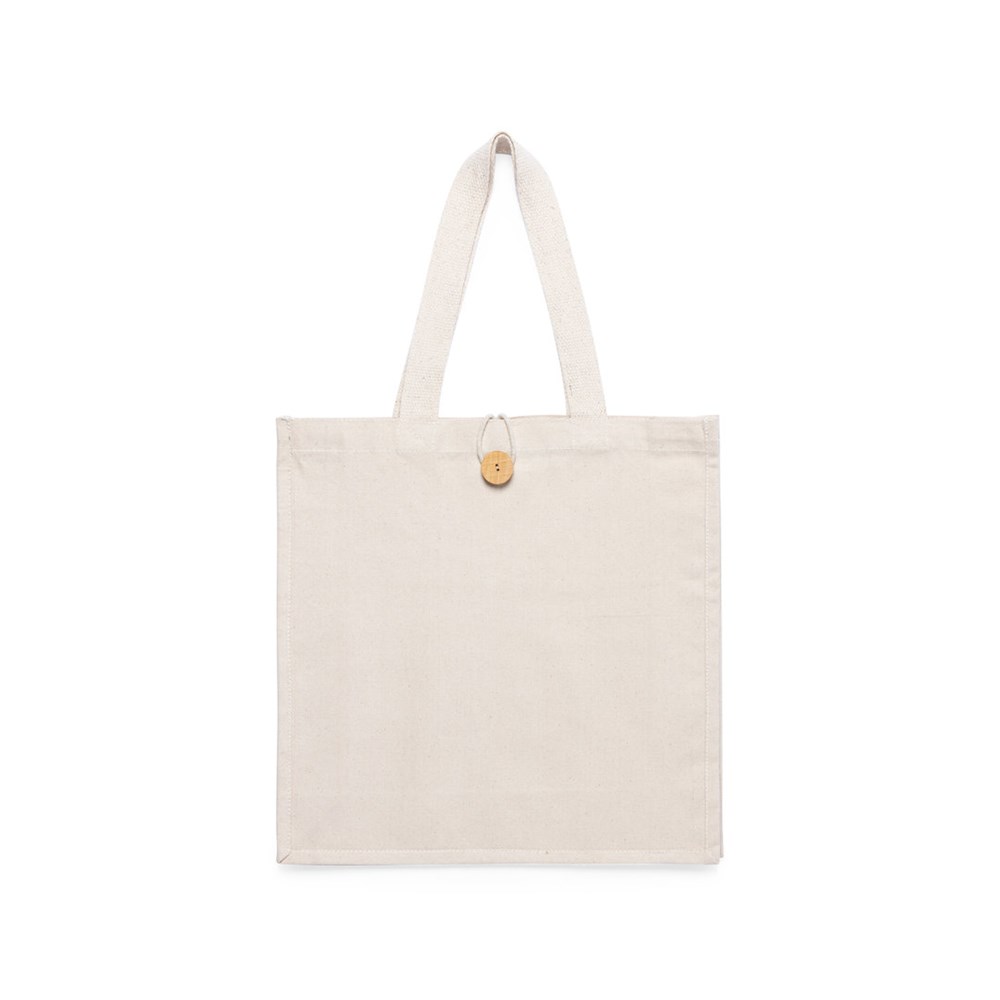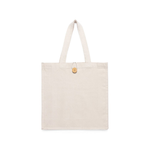 Bag made in cotton, natural finish and extra weight of 310g/m2. With original button closure, stitched finish and gusset. Extra wide and reinforced medium handles (60 x 3,5 cm). Resistance up to 10 kg weight.