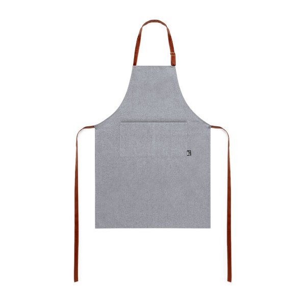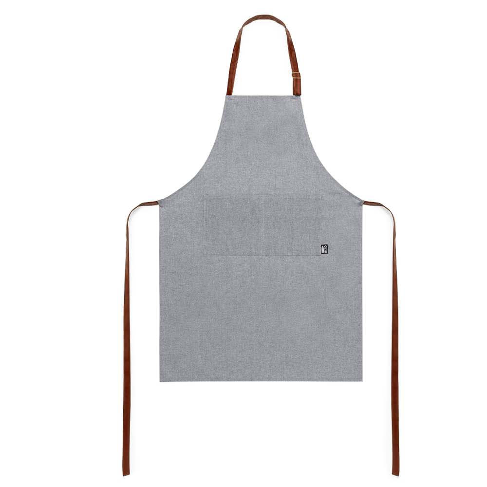 Nature line apron in RPET material, made from recycled plastic, to promote the reuse of plastic waste and help the sustainability of the planet. Fitted under the knee, with adjustable straps in resistant PU leather and a large front pocket. Label on pocket with RPET logo.