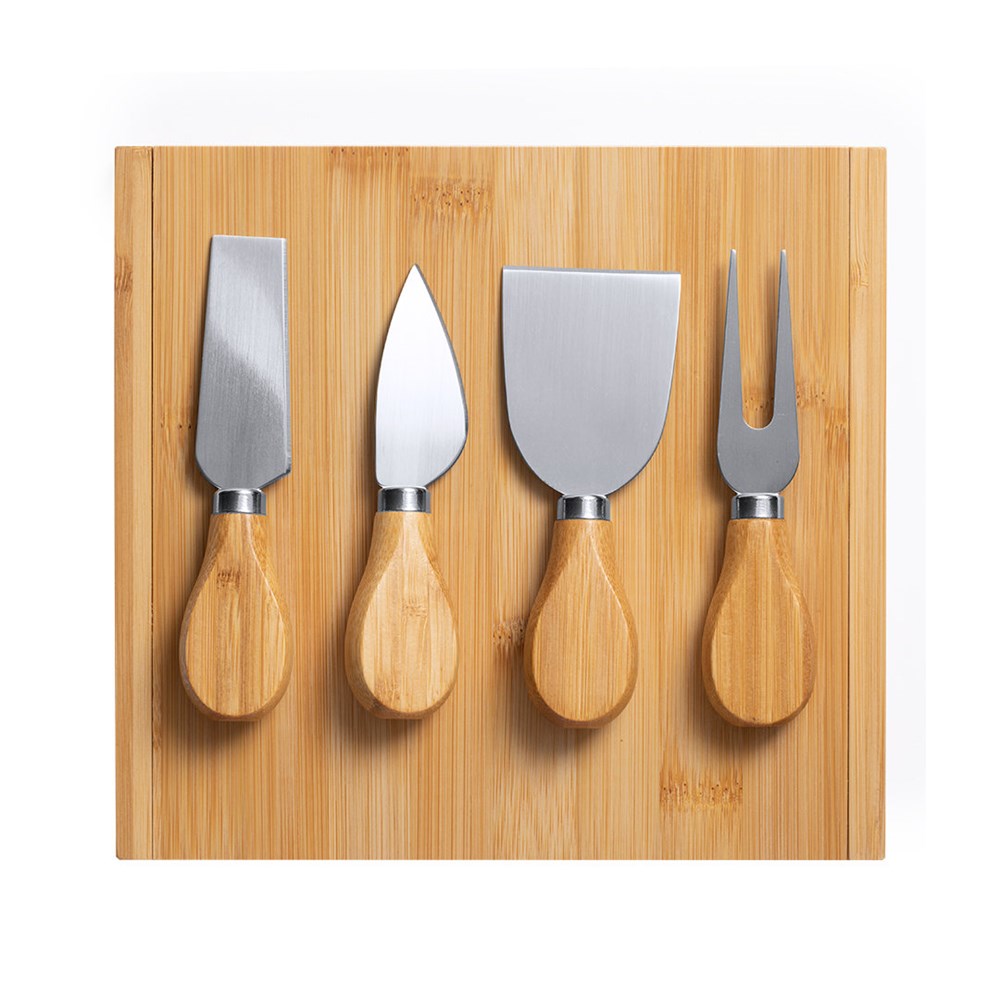 Original cheese set in a folding box with rectangular shape. Die-cut inside for each accessory. Accessories in stainless steel with bamboo handle. Presented in an individual box with kraft design.