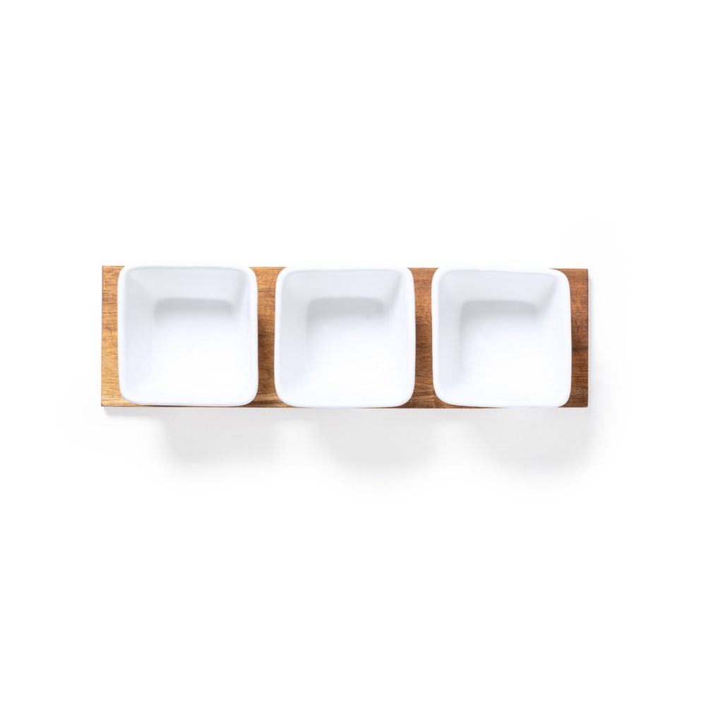 Appetizer tray with 3 bowls in white color and made of ceramic. Includes natural wood base, die-cut to fit the bowls. Presented in an individual box with kraft design.