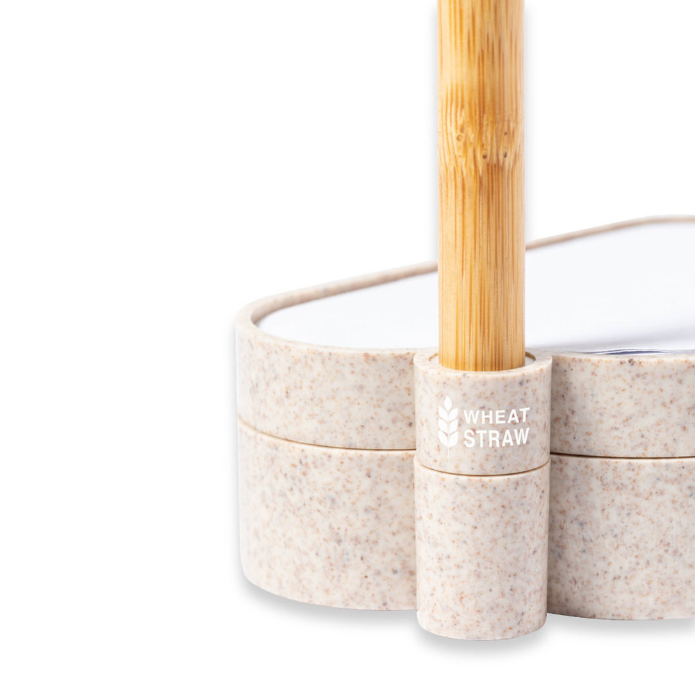Nature line, seed notepad holder with original cloud design. Including: Notepad with 80 white notes in the shape of a cloud.Base with pen holder and two compartments, with a sheet of seed paper included. Made of wheat straw, to promote the use of natural raw materials and reduce pollutant emissions.Ball pen pointer with body made of bamboo cap and details in wheat straw. In blue ink.Set presented in an individual box with kraft design, with instruction manual in English and Spanish.